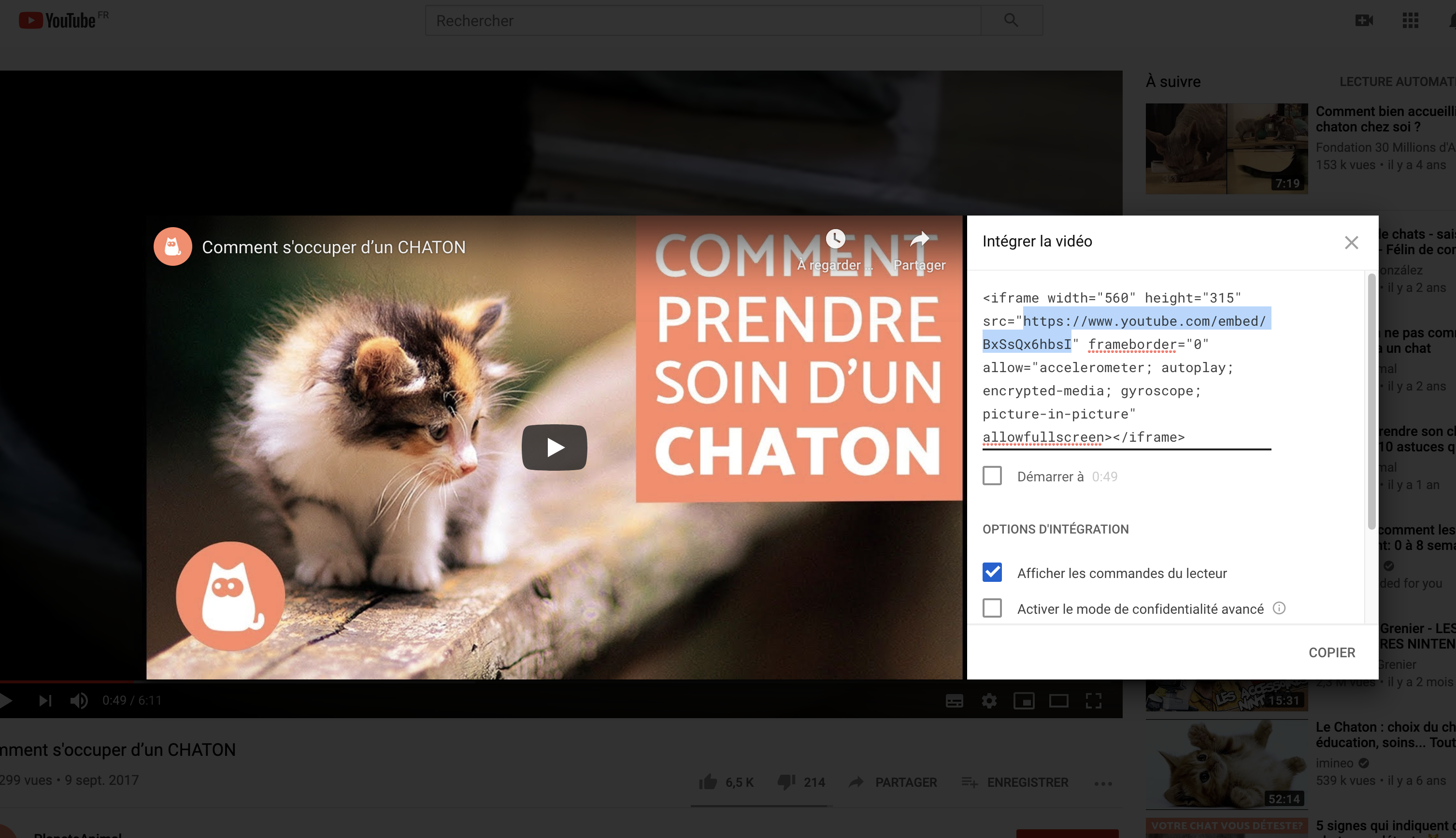 Ce qu'il faut trouver pour que ça fonctionne, c'est donc l'url iframe de notre vidéo. Pour trouver ce fameux lien “iframe”, il faut aller sur la page youtube de la vidéo, cliquer sur “partager”, puis sur “intégrer”, puis copier l'url qui s'affiche au milieu du bloc de code (image ci-dessous).